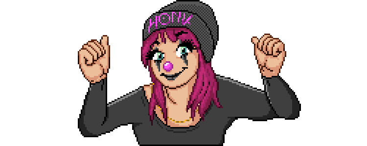 I'm pix.EXE! A virtual Edutainment ClownTuber! I made my debut in the "hit" 1993 computer game Circuit Circus selling an incredible 3 copies world-wide. Now, I'm back and booted up to learn and spread some clown cheer!I make pixel art, chiptune, digital art, and have been dabbling in Game Dev!Currently we're working on an RPG Maker Game, WANDERDUST!
